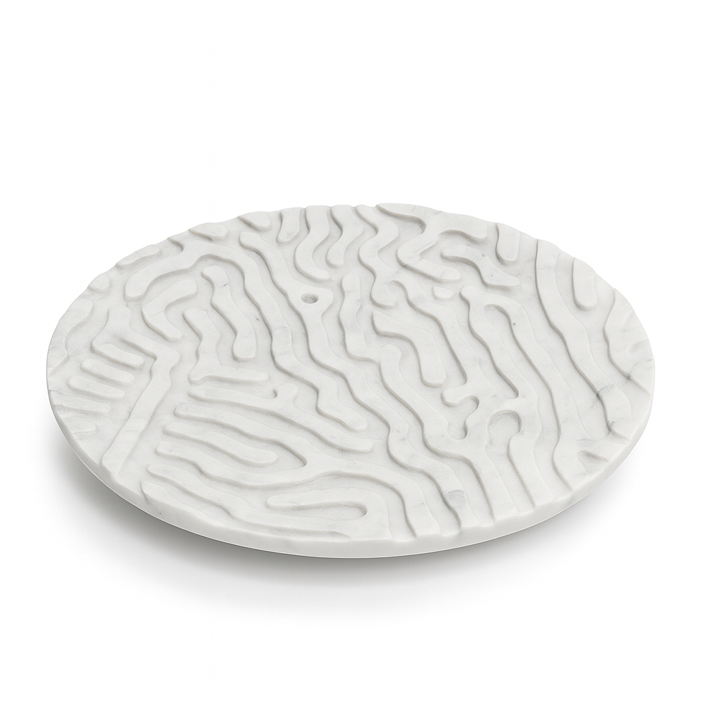 Discover the Macael Labyrinth Plate, a sculptural piece that combines contemporary craftsmanship with the timeless elegance of white Macael marble. Its flat surface is carefully carved with an organic relief pattern, inspired by fluid shapes that evoke nature and add visual depth.