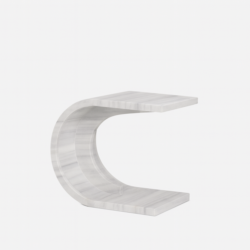 This side table, made from Blanco Macael marble, is a piece with a strong sculptural character that combines art, design, and timeless luxury. Its distinctive C-shape creates a fluid, architectural silhouette, providing visual lightness without sacrificing the solidity of natural stone.