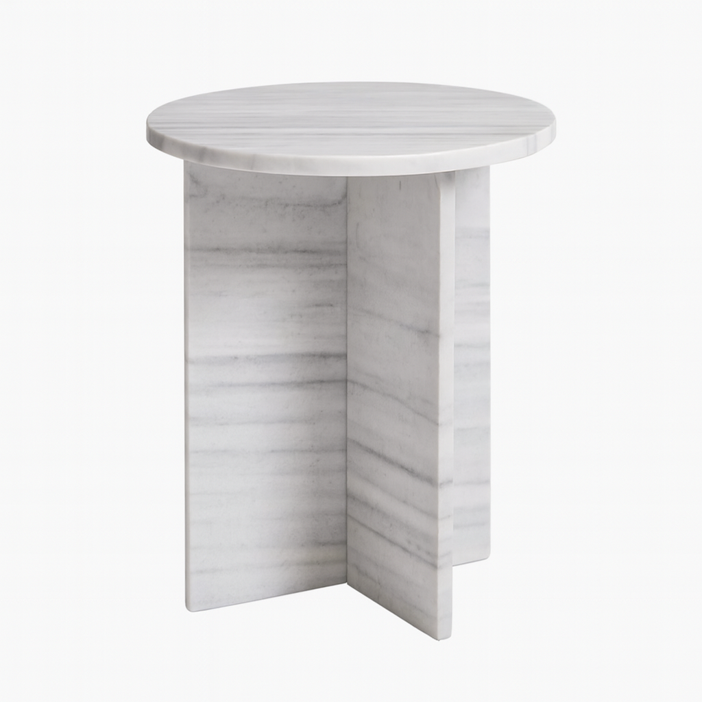 This Blanco Macael marble side table is a pure expression of contemporary sophistication and architectural design. Its balanced composition, consisting of a circular top with soft lines and a solid geometric base, creates a piece that is both imposing and refined in equal measure.