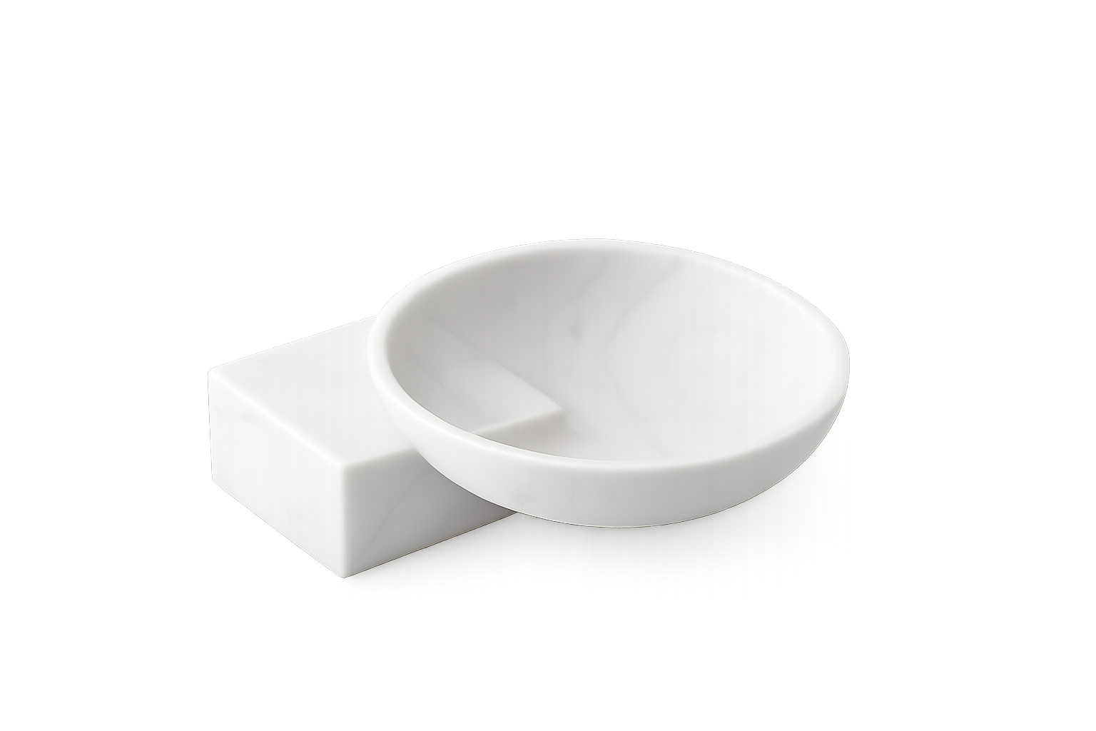 This centerpiece has been hand-carved from white Macael marble, one of the most noble and prized stones for its purity, luminosity, and natural elegance. Its balanced design, composed of a gently modeled circular shape on an architectural base, conveys a sense of serene solidity and timeless sophistication.