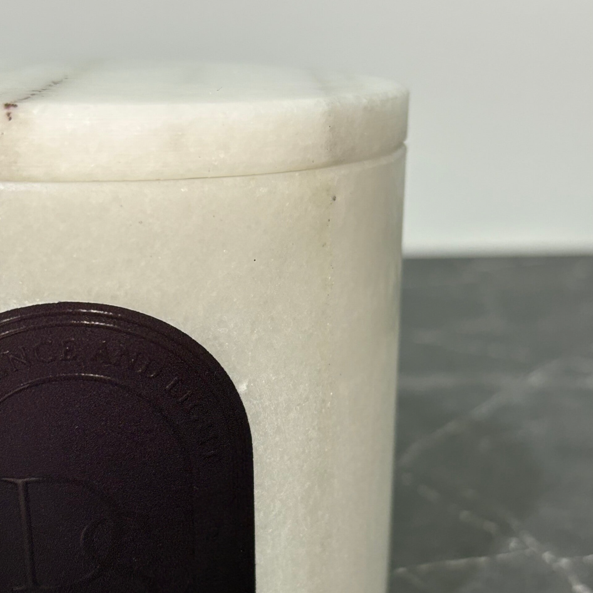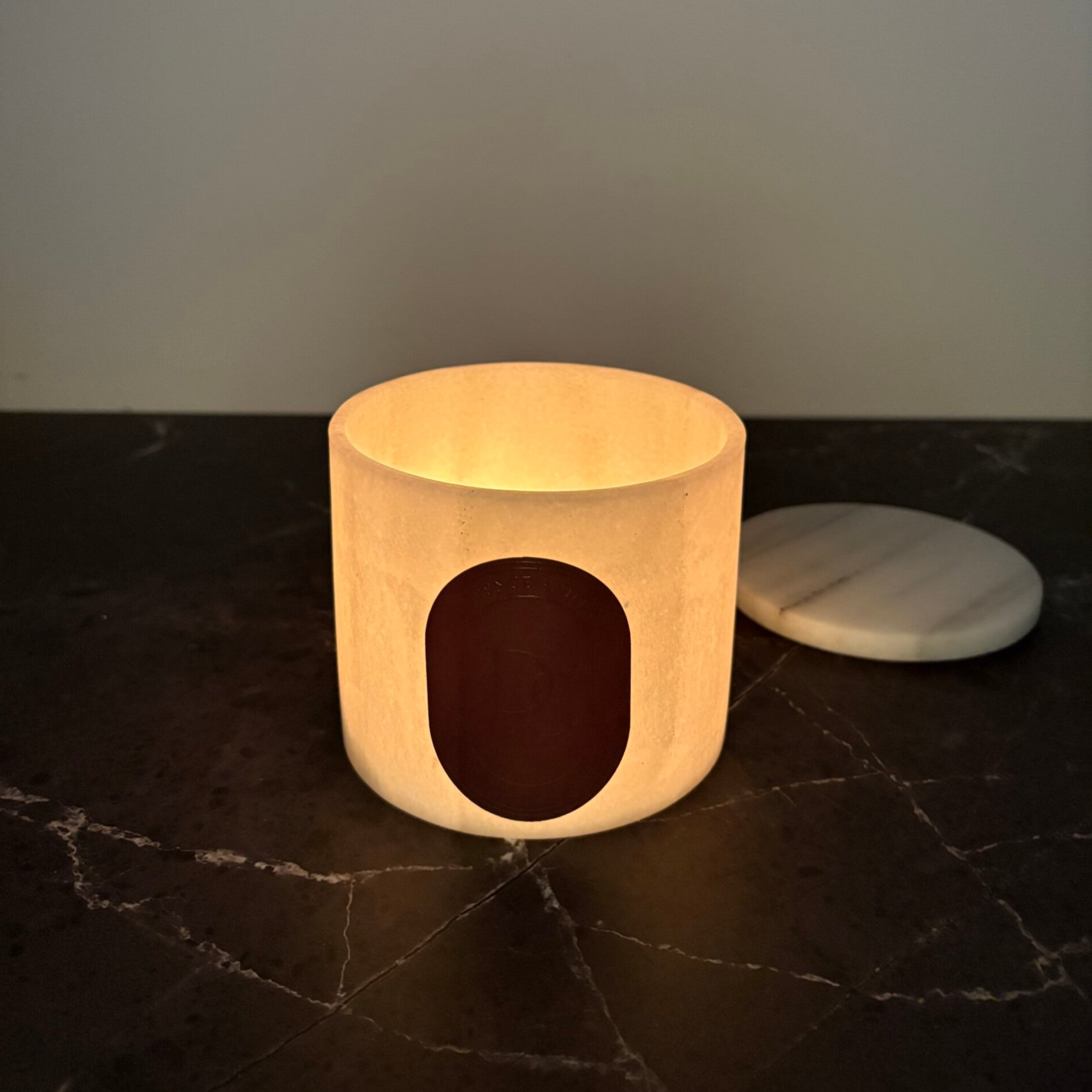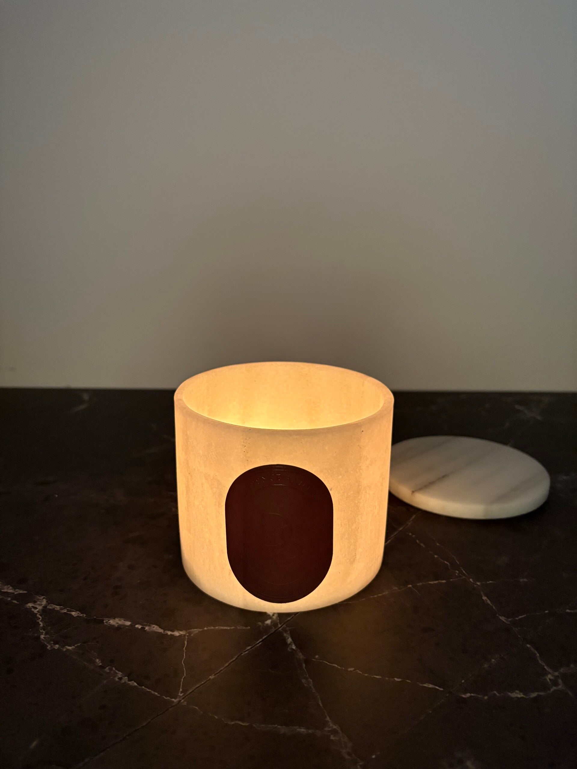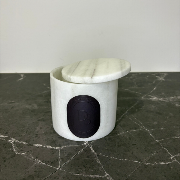 Carved from natural white marble, this candle reveals the beauty of the essential through its pure and balanced form—11 cm in diameter, 9 cm in height, and a delicate thickness of 7 mm.